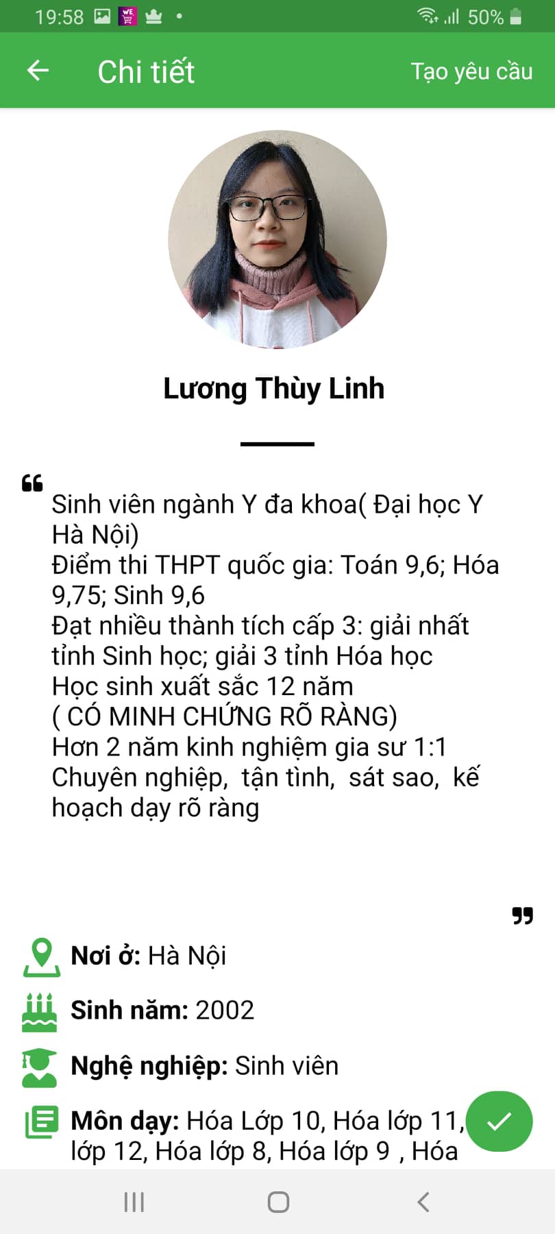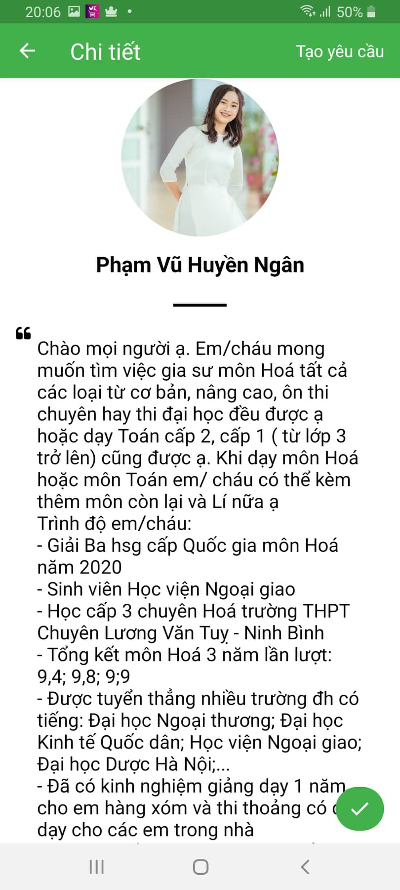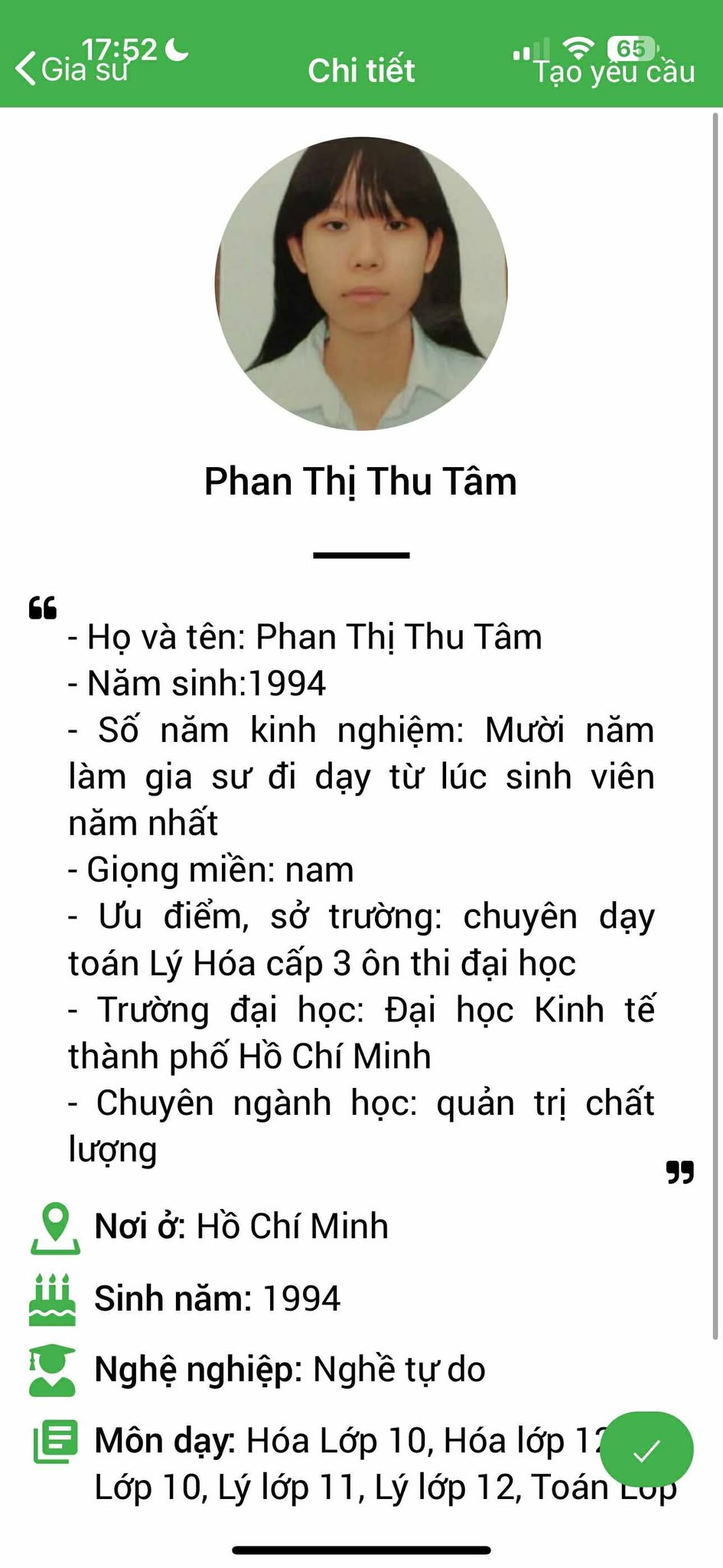 Mình đã làm việc với Daykemtainha.vn từ thời là sinh viên giờ mình đã là giáo viên đang đứng lớp, Mình từng nhận lớp tại trung tâm rất nhiều lớp, trung tâm làm việc chuyên nghiệp, rõ ràng, mình có thể nhận lớp qua chuyển khoản nên rất tiện, lớp bị hủy cũng đều được trung tâm chuyển khoản lại, mình thất rất okie.