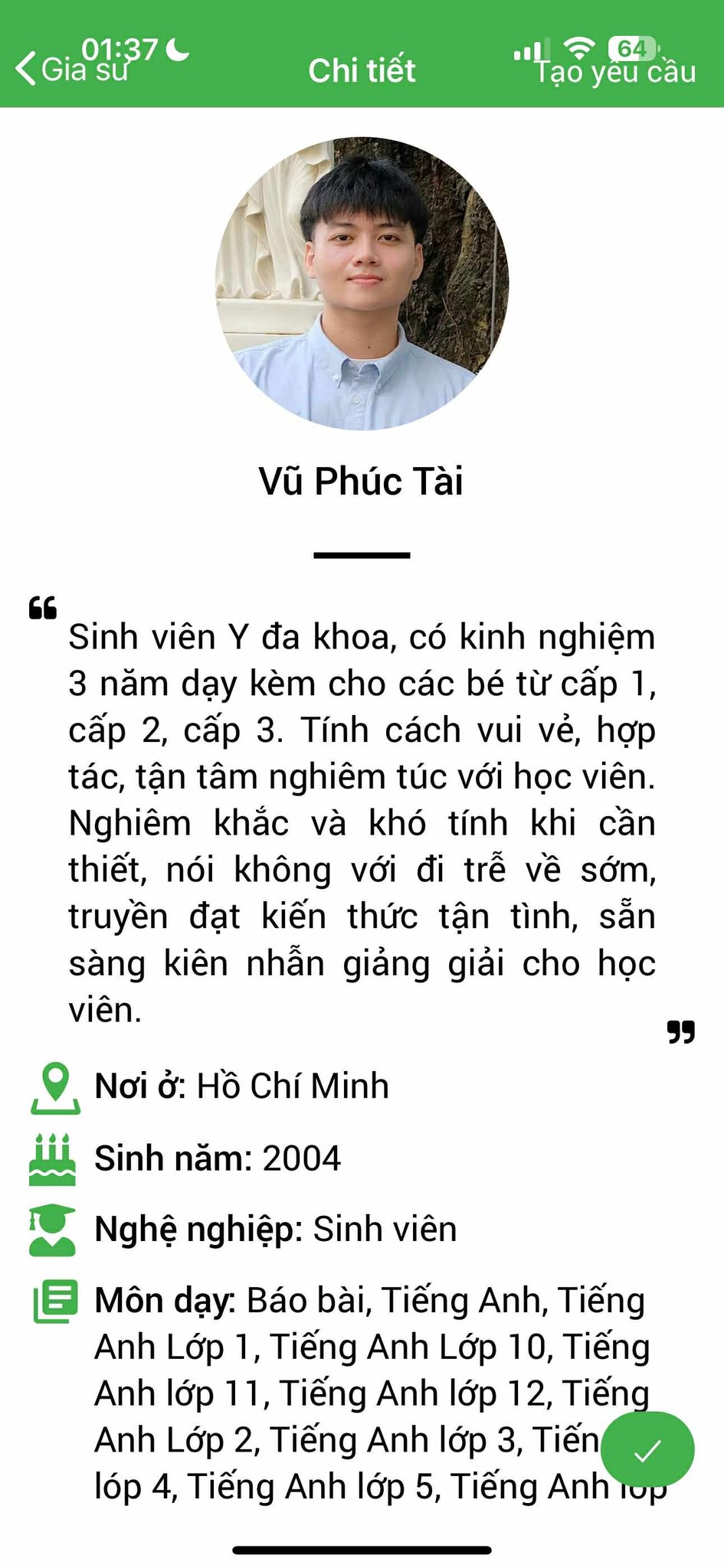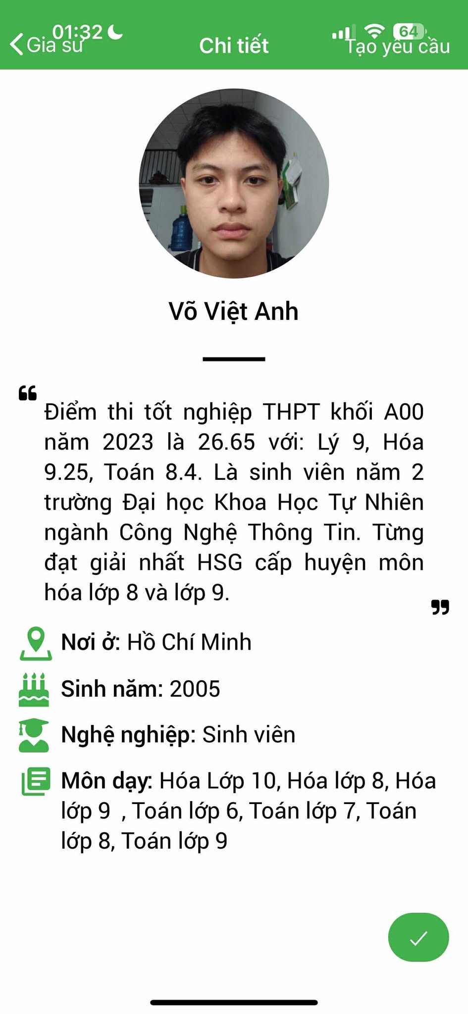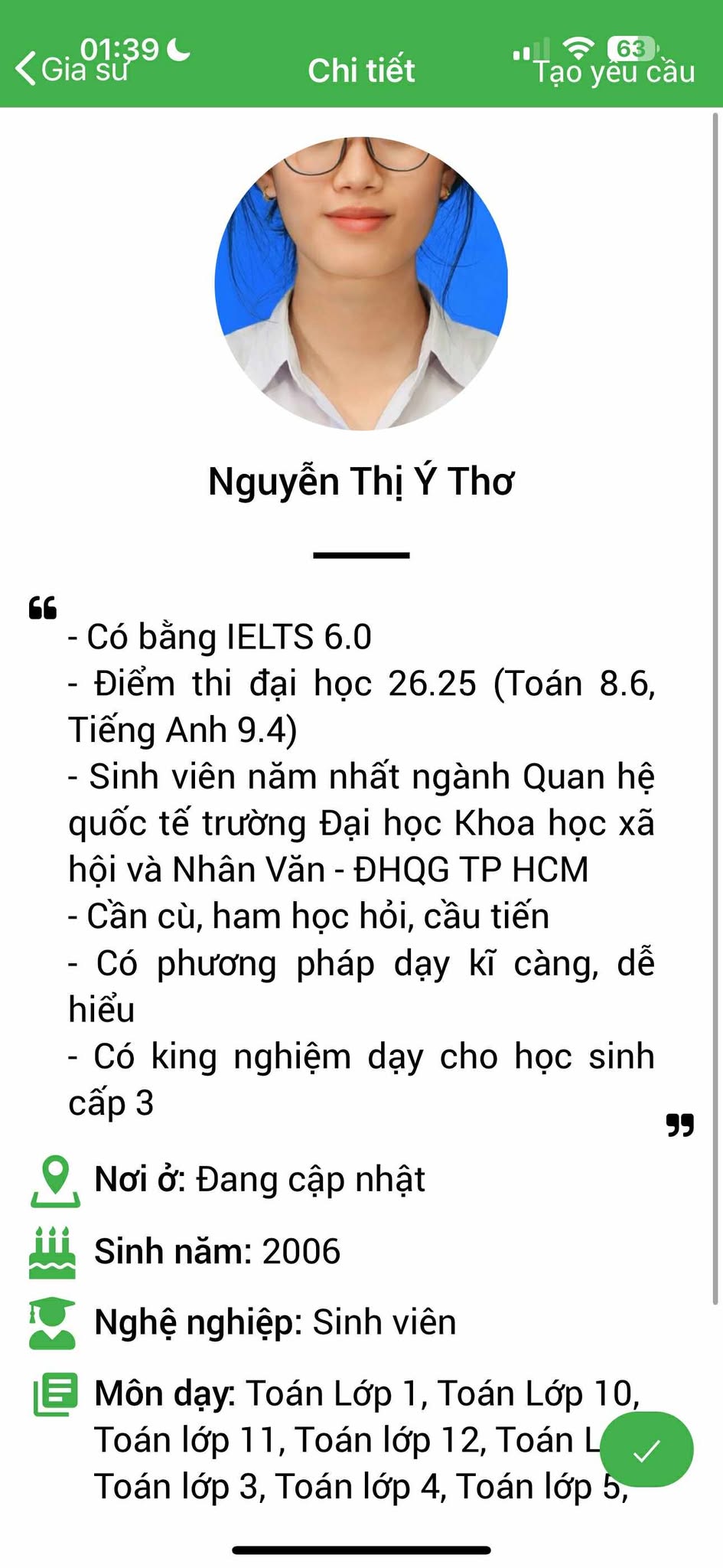 Mình đã làm việc với Daykemtainha.vn từ thời là sinh viên giờ mình đã là giáo viên đang đứng lớp, Mình từng nhận lớp tại trung tâm rất nhiều lớp, trung tâm làm việc chuyên nghiệp, rõ ràng, mình có thể nhận lớp qua chuyển khoản nên rất tiện, lớp bị hủy cũng đều được trung tâm chuyển khoản lại, mình thất rất okie.