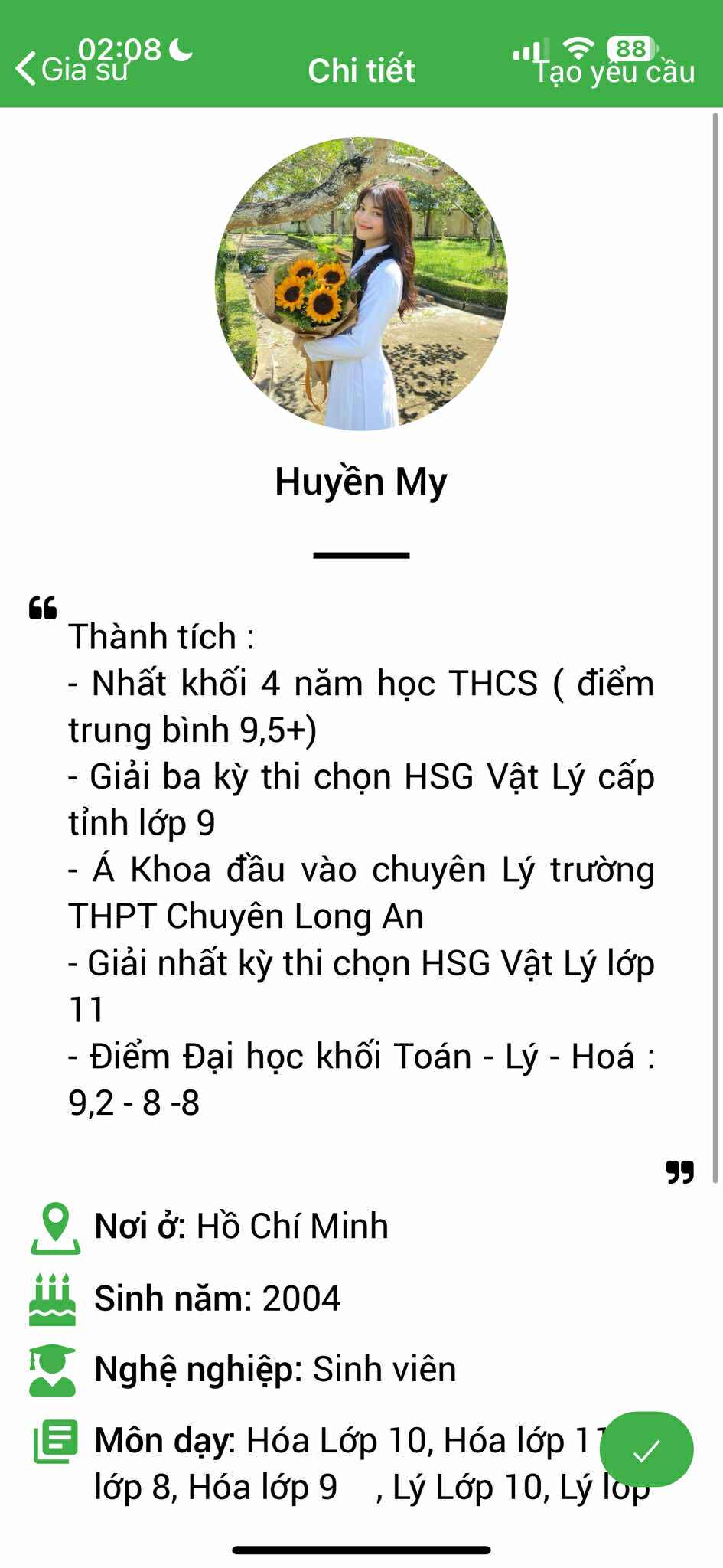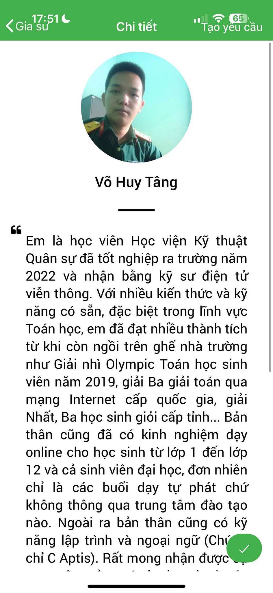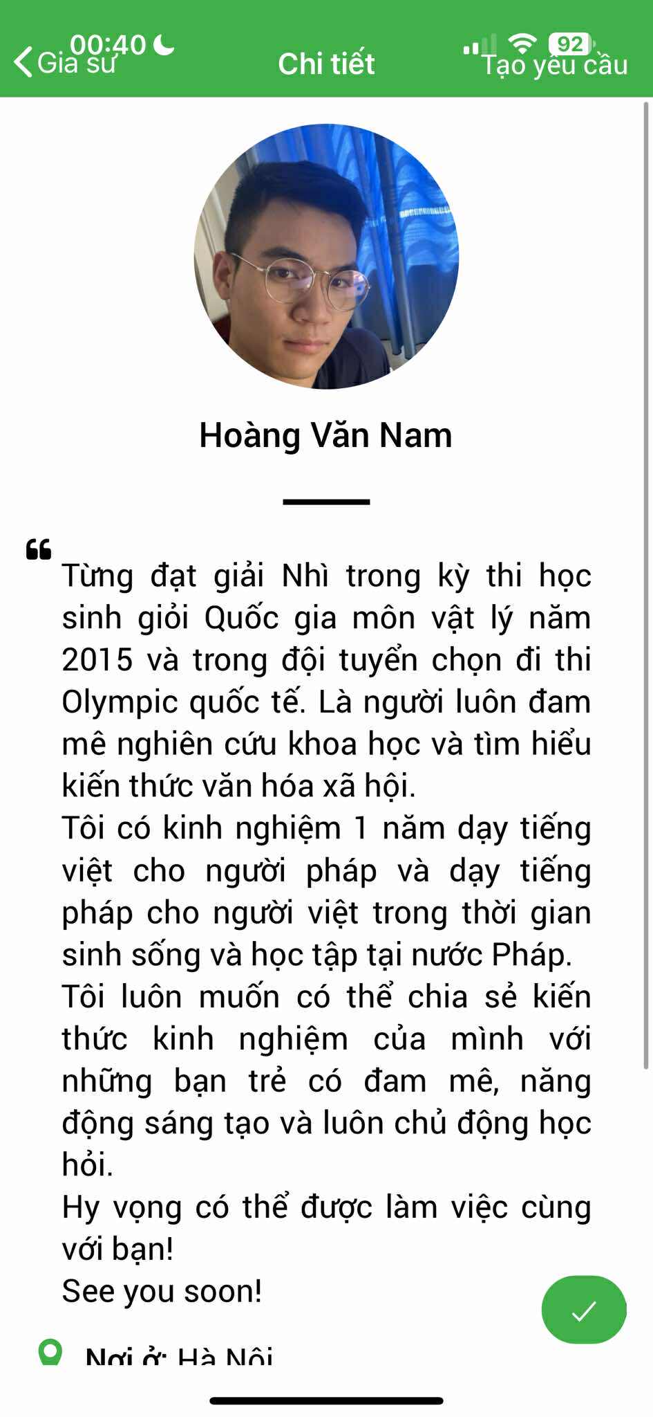 Được anh mình giới thiệu Daykemtainha.vn, mình nhận dạy kèm nhiều lớp tại đây, mình rất quý mến cách các chị làm việc, mình có giới thiệu cho bạn bè của mình nữa, hiện tại mình đang dạy nhiều bé học trò do trung tâm giới thiệu, mình rất yêu quý nghề này, cám ơn Daykemtainha.vn trong suốt thời gian qua, mong sẽ được hợp tác dài lâu.