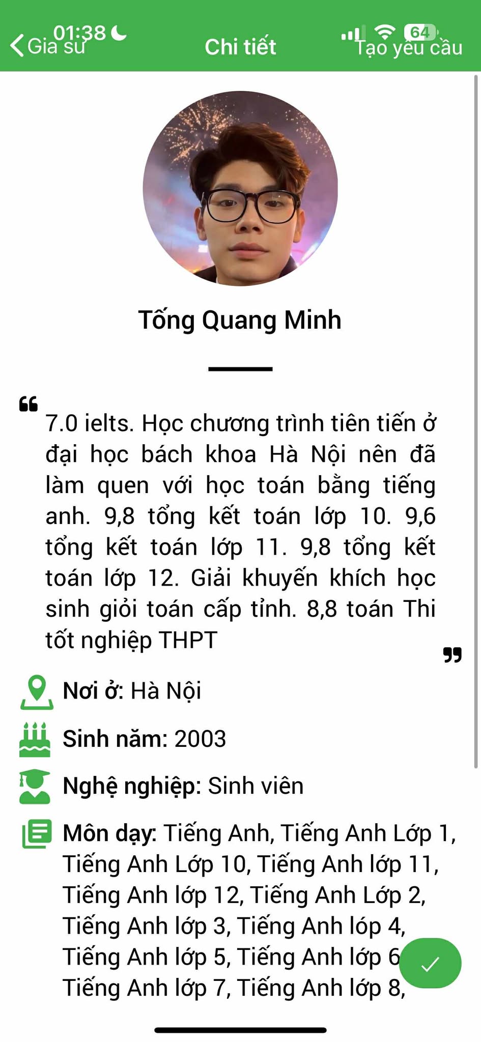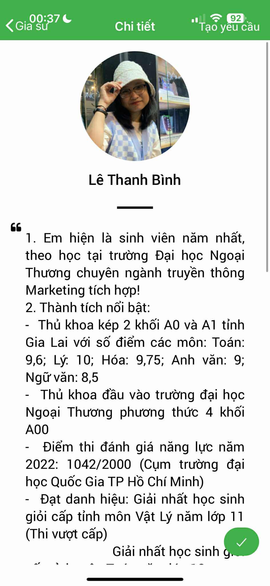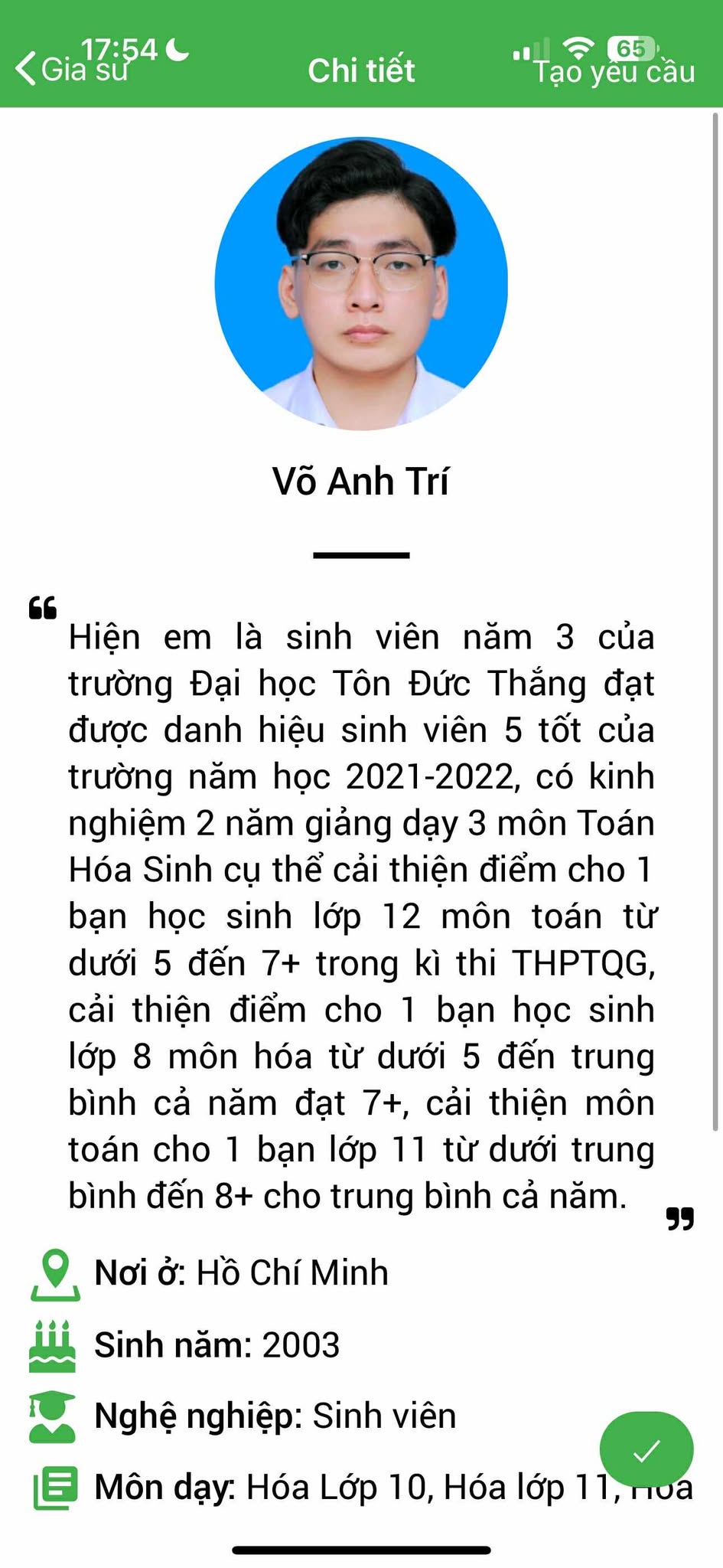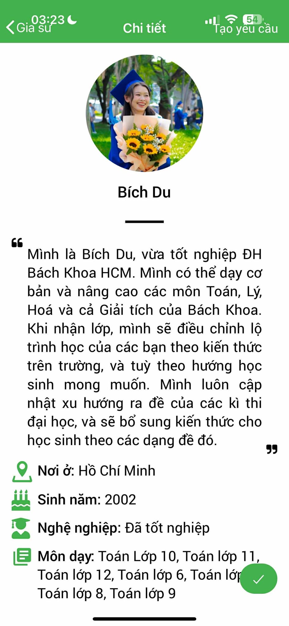 Được anh mình giới thiệu Daykemtainha.vn, mình nhận dạy kèm nhiều lớp tại đây, mình rất quý mến cách các chị làm việc, mình có giới thiệu cho bạn bè của mình nữa, hiện tại mình đang dạy nhiều bé học trò do trung tâm giới thiệu, mình rất yêu quý nghề này, cám ơn Daykemtainha.vn trong suốt thời gian qua, mong sẽ được hợp tác dài lâu.