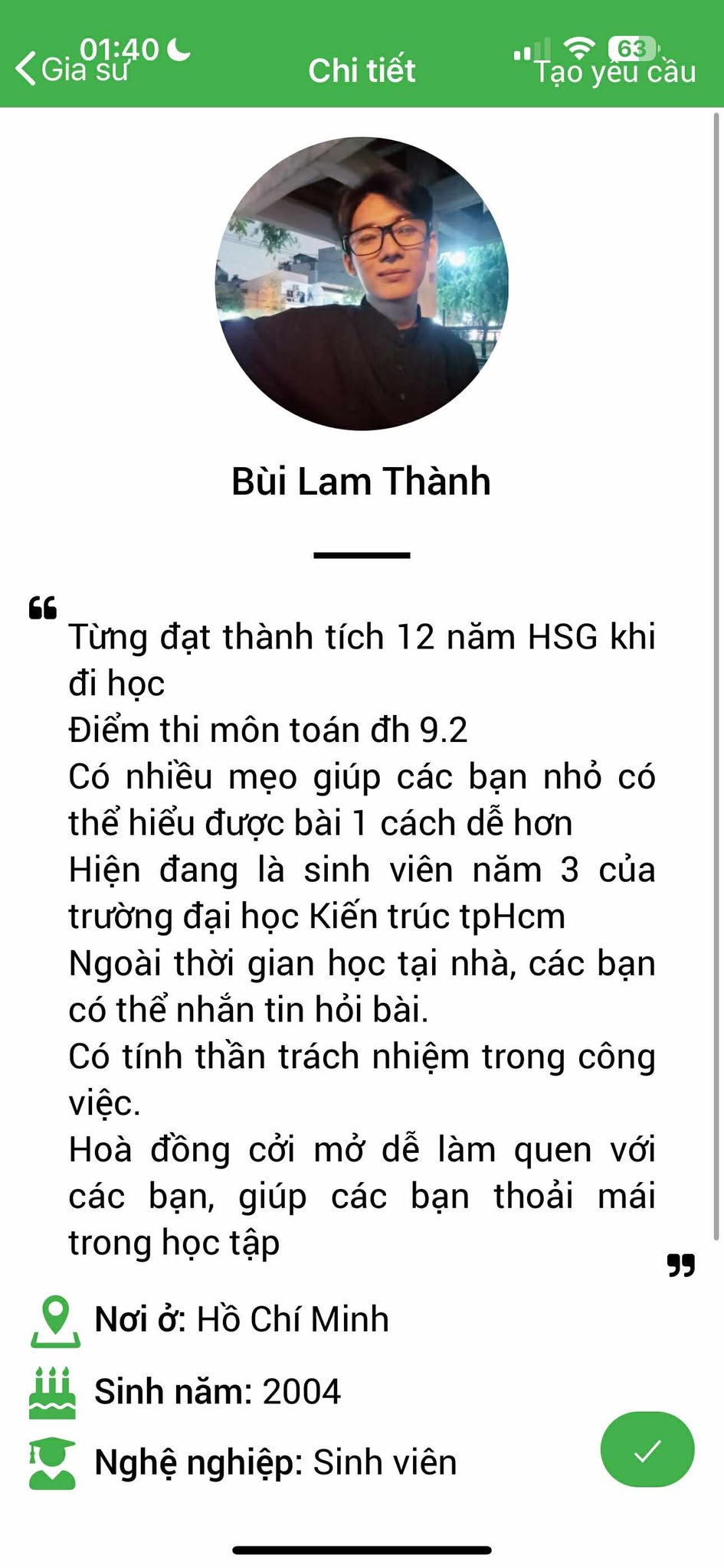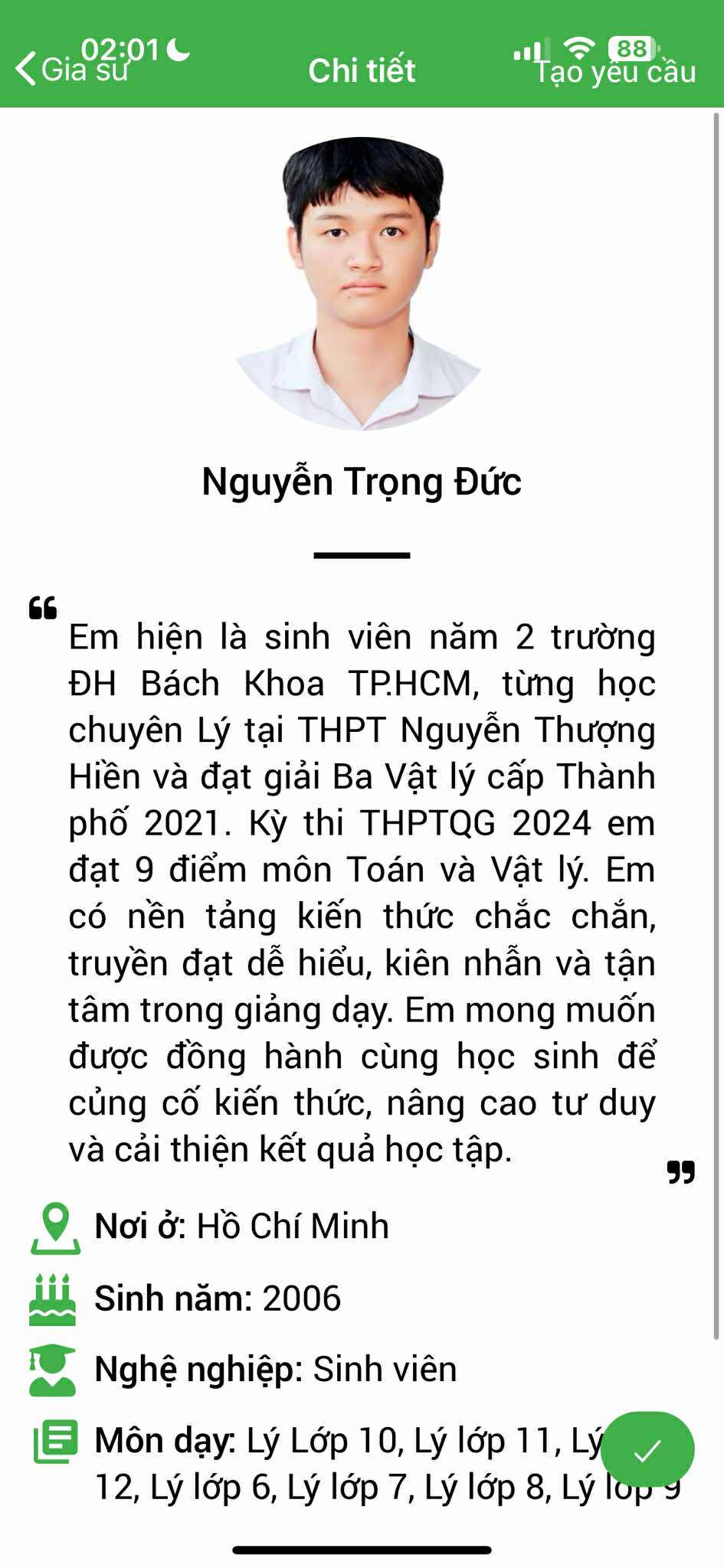 Bằng những thao tác đơn giản và thuận tiện, các học viên sẽ tìm cho mình gia sư phù hợp bằng nhiều tiêu chí khác nhau, dễ dàng tra cứu thông tin gia sư và nội dung lớp học; đồng thời có thể gửi yêu cầu học thử 02 buổi với gia sư mà mình chọn, nếu không phù hợp thì học viên sẽ được tư vấn kỹ hơn và tiếp tục chọn gia sư đến khi nào phù hợp mới thôi.