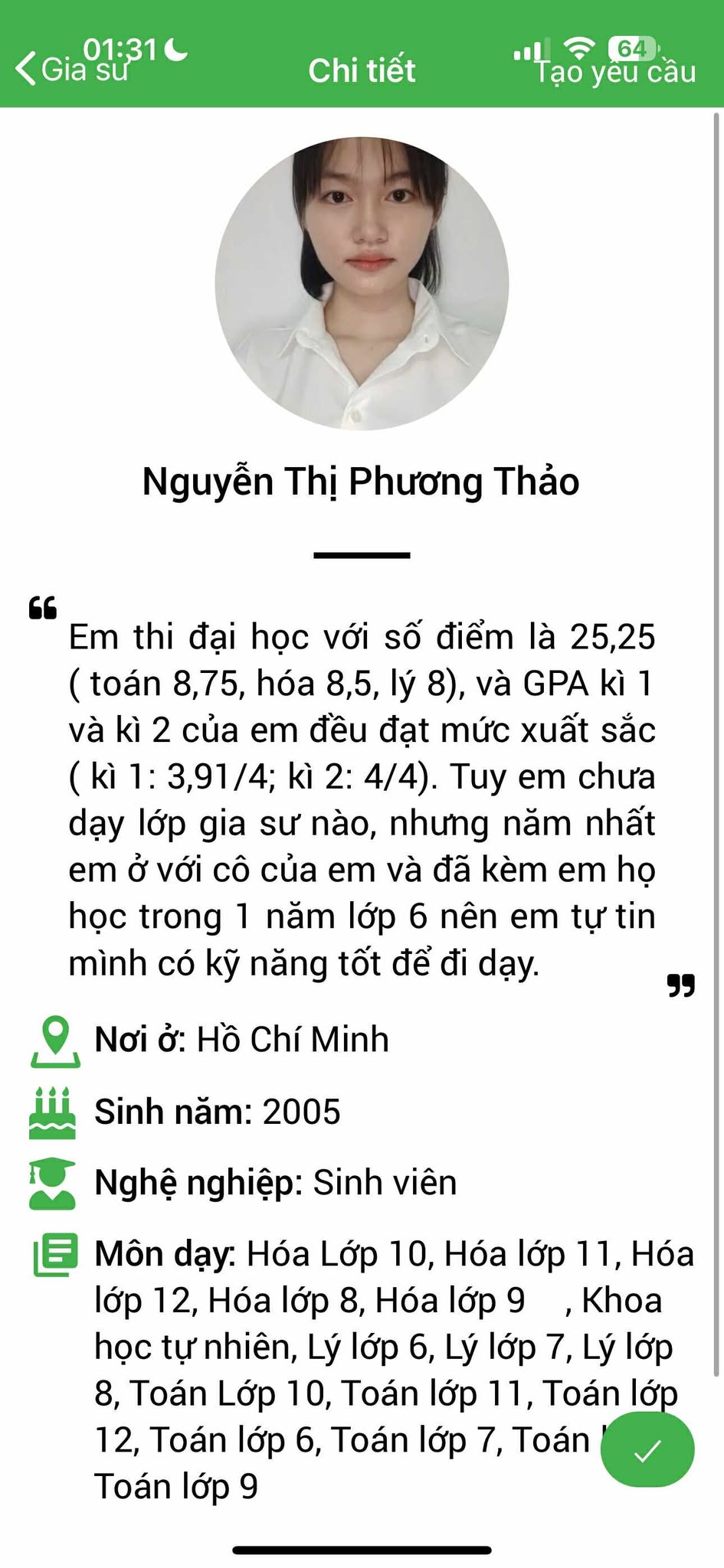 Mình là Thảo My giáo viên chuyên môn Piano, mình nhận lớp tại Daykemtainha.vn rất nhiều, hiện tại mình đang full lớp, không có thời gian nghỉ ngơi luôn, à mình chia sẻ về cách làm việc của trung tâm nhé, mình hợp tác tại đây rất okie, lớp được bảo lãnh trong 1 tháng, nên các lớp lỗi từ học viên phụ huynh My đều nhận lại được phí. rất vui được làm việc với daykemtainha.vn