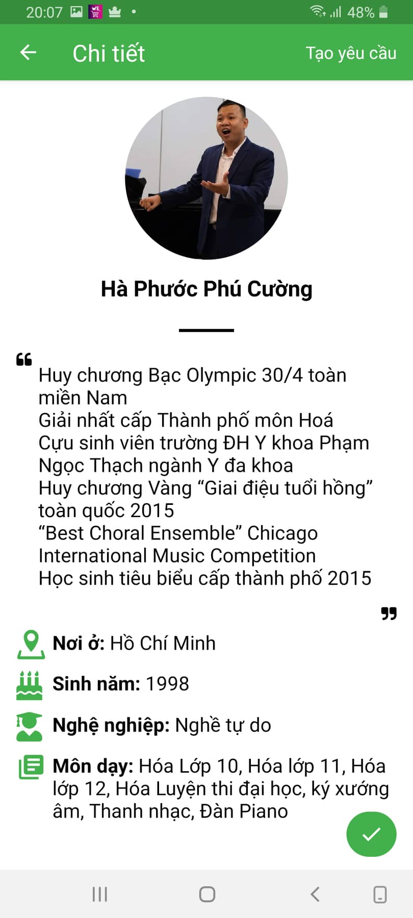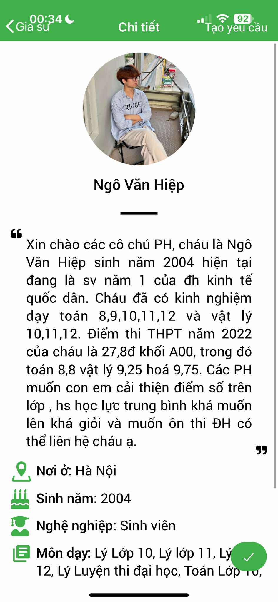 Mình là Nhàn gvien dạy guitar, mình thường xuyên nhận lớp tại ứng dụng daykemtainha.vn, do mình dạy nhiều nên không có thời gian qua trung tâm, mình chỉ qua 2 lần tại quận 8 phạm thế hiển còn những lần sau đa số mình nhận lớp qua chuyển khoản, nhận lớp tiện lợi, lớp có trục trặc từ phụ huynh mình đều được chị My chuyển khoản lại. mình nhận lớp ở đây rất an tâm.