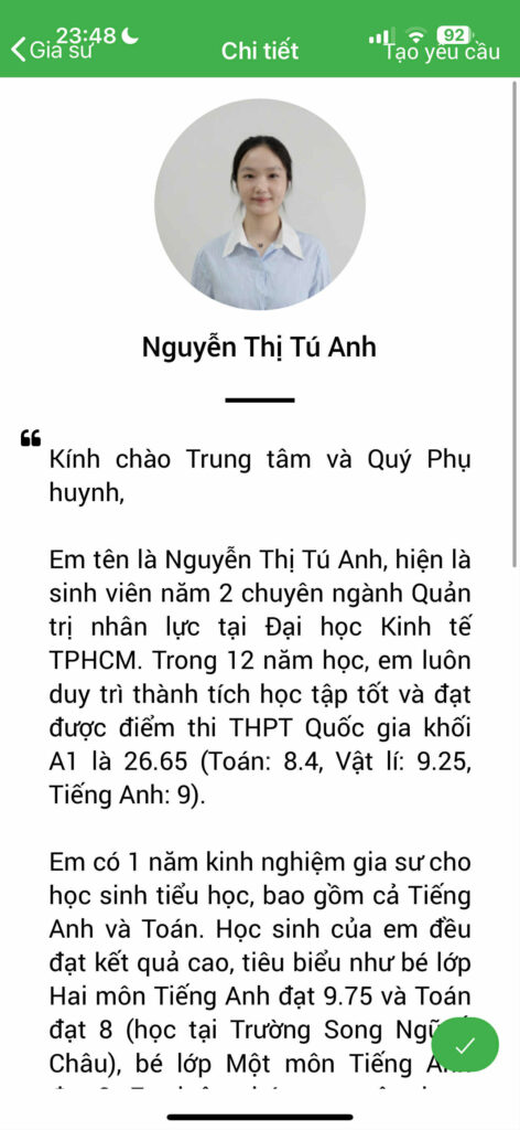 Mỗi gia sư tại Daykemtainha.vn không chỉ là người giảng dạy mà còn là người hướng dẫn tận tâm, đồng hành cùng học sinh trong việc khám phá niềm yêu thích với Toán học và xây dựng các kỹ năng học tập hiệu quả. Triết lý “lấy tâm huyết làm kim chỉ nam” đã giúp Daykemtainha.vn thiết lập được lòng tin sâu sắc từ phụ huynh và sự gắn kết mạnh mẽ từ học sinh.