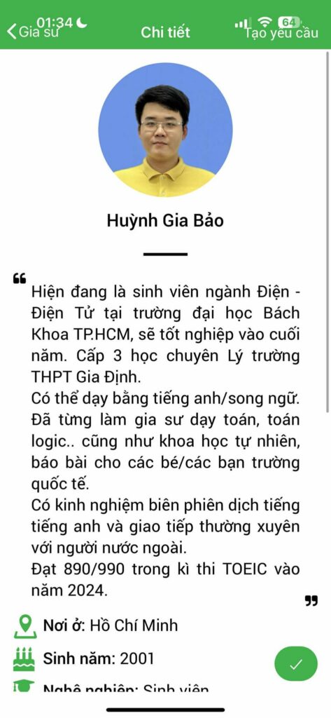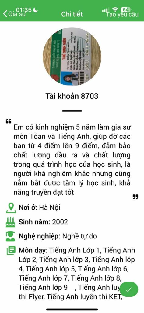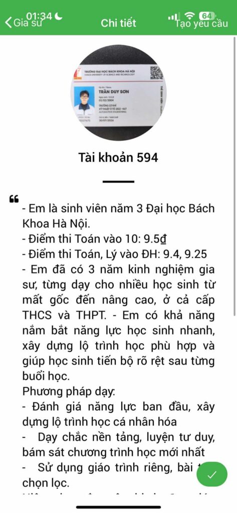 – Tất cả gia sư toán của Daykemtainha.vn có thông tin rõ ràng, minh bạch (Thông tin gia sư gồm cmnd, bằng cấp, thẻ sinh viên được gia sư cập nhật đầy đủ lên hệ thống website và ứng dụng Daykemtainha.vn, phụ huynh có thể xem thông tin gia sư được chọn đến dạy cho con mình gồm đầy đủ giấy tờ cần thiết).