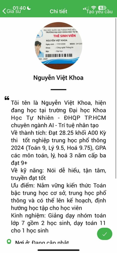 Gia sư của Daykemtainha.vn sẽ tới nhà học sinh dạy, hình thức này giúp tiết kiệm thời gian cũng như chi phí đi lại cho con em của quý phụ huynh. Cam kết đội ngũ gia sư giỏi là những người có trình độ chuyên môn cao và có tâm với nghề. Quý phụ huynh có thể truy cập hệ thống website và ứng dụng Daykemtainha.vn của chúng tôi để tham khảo danh sách gia sư và lựa chọn cho con em mình một gia sư dạy kèm thích hợp. Tất cả các thông tin gia sư gồm cccd, bằng cấp, thẻ sinh viên được gia sư cập nhật đầy đủ lên hệ thống website và ứng dụng Daykemtainha.vn, phụ huynh có thể xem thông tin gia sư được chọn đến dạy cho con mình gồm đầy đủ giấy tờ cần thiết. Điều này giúp quý phụ huynh an tâm hơn, tránh trường hợp hoang mang trong tâm lý vì lo sợ các trường hợp lừa đảo hay giảng dạy chất lượng kém. Phương thức này đang được rất nhiều phụ huynh ưu tiên lựa chọn vì chúng nhanh chóng đem lại kết quả học tập như mong đợi cho con em họ.