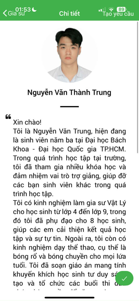 – Gia sư sinh viên tại Daykemtainha.vn: là những sinh viên ưu tú xuất thân từ các trường Đại học danh tiếng của TP HCM như: Đại học Sư Phạm, Đại học Bách Khoa, Đại học Kinh tế, Đại học Khoa học Xã hội & Nhân văn,… với điểm thi vào các trường Đại học như trên là từ 22 điểm.