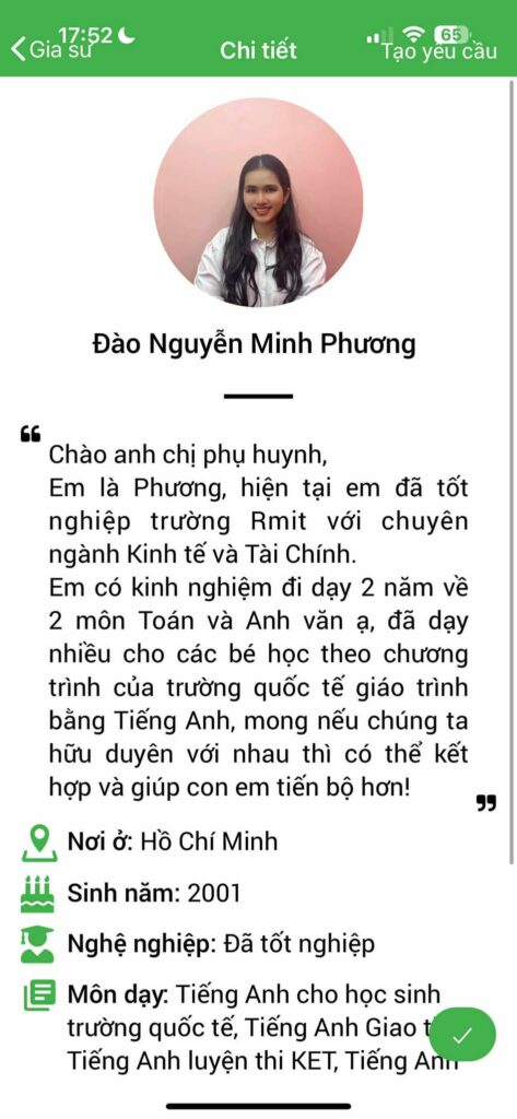 – Daykemtainha.vn kiểm duyệt khắt khe chất lượng gia sư: Tất cả gia sư phải trải qua quá trình tuyển chọn, phỏng vấn và kiểm tra chuyên môn trước khi giảng dạy, đảm bảo mang đến dịch vụ tốt nhất.