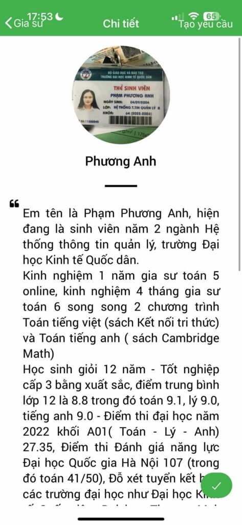 – Tất cả gia sư môn Toán của Daykemtainha.vn có thông tin rõ ràng, minh bạch (Thông tin gia sư gồm cmnd, bằng cấp, thẻ sinh viên được gia sư cập nhật đầy đủ lên hệ thống website và ứng dụng Daykemtainha.vn, phụ huynh có thể xem thông tin gia sư được chọn đến dạy cho con mình gồm đầy đủ giấy tờ cần thiết).